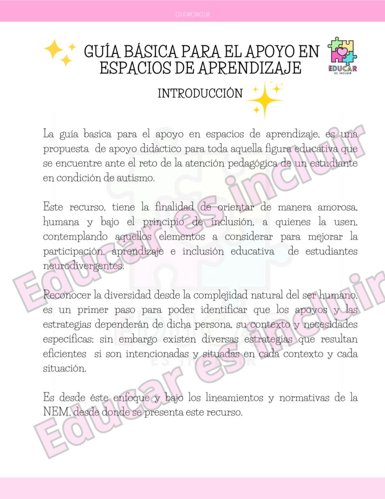 La guía basica para el apoyo en espacios de aprendizaje, es una propuesta de apoyo didáctico para toda aquella figura educativa que se encuentre ante el reto de la atención pedagógica de un estudiante en condición de autismo.